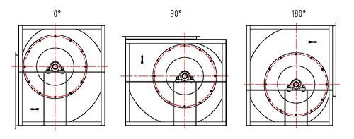 2.出風方向 EDF系列風機可制成0°、90°、180°三種出風方向,如下圖所示。