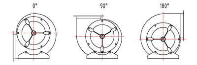AYF系列外轉子風機制成整體結構,風機可分為左旋和右旋兩種,即從電機出線一側正視,葉輪逆時針旋轉稱為左旋,葉輪順時針旋轉稱為右旋。用戶訂貨時須注明風機旋向。AKF系列外轉子風機可制成0°、90°、180°三種常規角度(如下圖所示),也可按客戶要求制成任何安裝角度。