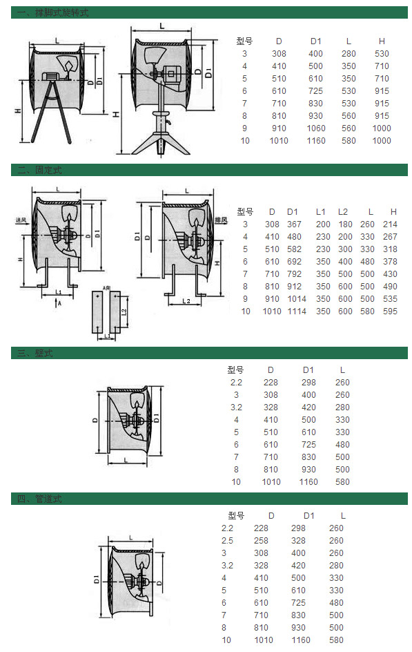 本系列風機有三種型式::DZ-11型壁式,DZ-12型崗位式,ZD-13管道式。特殊場合按用戶要求可加工成網罩,彎頭或自垂百葉等形式。