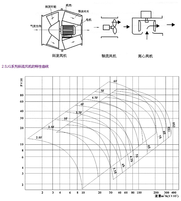 斜流式管道通風機與離心式風機和軸流式風機相比較,具有獨特的直線型結構和介于兩者之間的空氣動力特性參數。